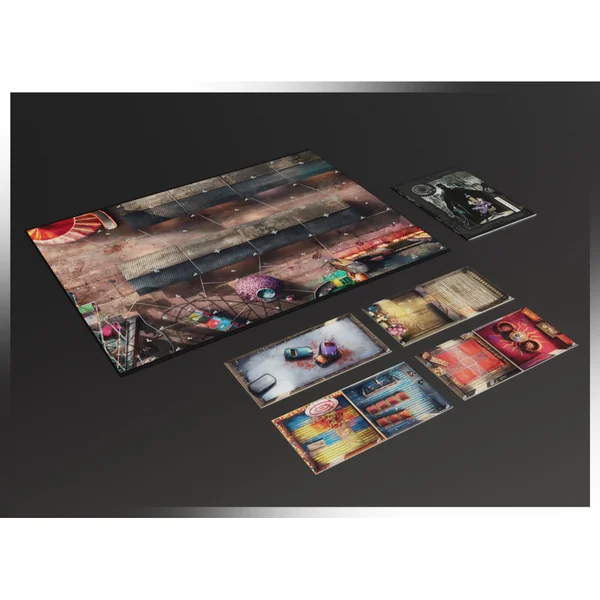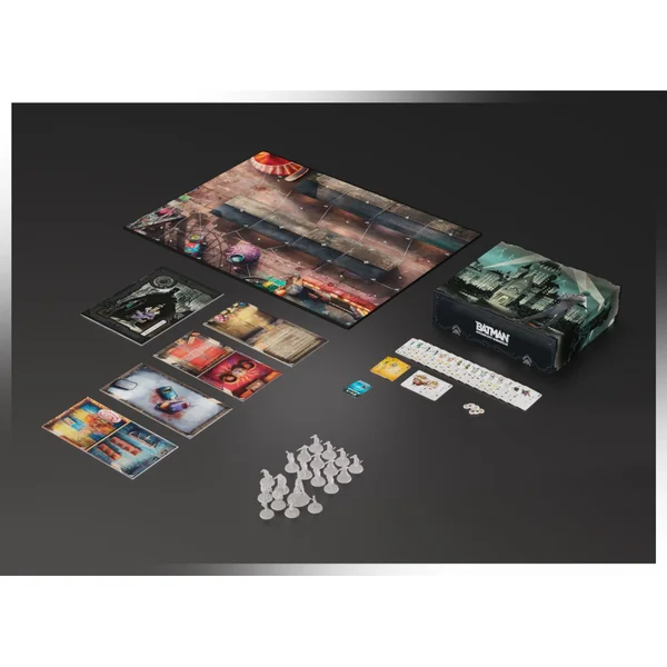Dans les méandres de Gotham City, se trouvent des lieux remplis de noirceur et de démence. C’est au cœur d’une partie de l’asile d’Arkham que vous évoluerez au cours des différentes missions et découvrirez ses salles de soins, ses couloirs sécurisés et bien entendu ses cellules réservées à de célèbres patients. Puis vous vous baladerez du côté festif dans le parc d’attraction du Joker, qui est mortel dans tous les sens du terme. Ces deux sites, vous feront sombrer lentement dans la folie. Cette extension, enrichit l’expérience de jeu en ajoutant un nouveau plateau représentant au recto le célèbre asile d’Arkham et au verso le plateau Joker funhouse. Ce dernier possède 4 tuiles d’attractions recto-verso permettant de moduler le plateau de jeu et de participer à des « animations » différentes.