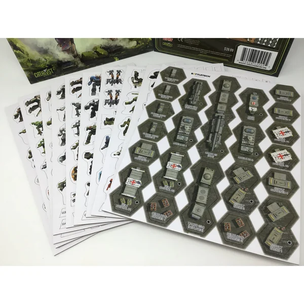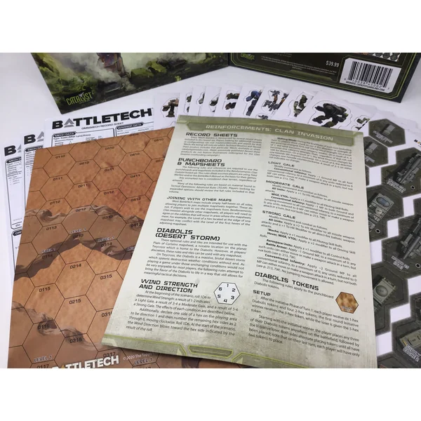 Cette boîte contient près de 200 standess en carton de haute qualité, en couleurs, représentant tous les ‘Mechs et les Élémentaux redessinés grâce à la campagne de financement participatif BattleTech: Clan Invasion. Sont également inclus 248 fiches techniques détaillant les variantes et configurations principales de chaque ‘Mech. Une carte double format offre les toutes premières représentations de la Plaine Curtains et de la Grande Brèche sur la planète Twycross, deux champs de bataille emblématiques de l’invasion des Clans. Enfin, une planche prédécoupée d’unités de soutien et de pions de tempête Diabolis—accompagnée de règles associées—donne vie à Twycross sur votre table.