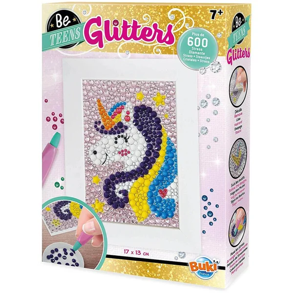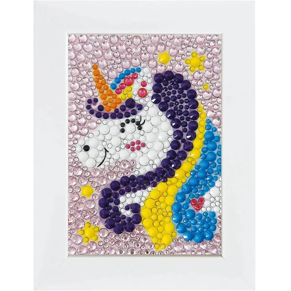 Colle les strass sur les numéros, lettres ou symboles correspondants pour créer un tableau unique ! Un stylet avec pointe en cire spécialement développé pour attraper facilement les strass et les déposer sur la surface autocollante du tableau. 3 diamètres de strass différents. Des strass brillants et des strass mats. Une fois les strass collés, l’enfant place le tableau dans un joli cadre en bois blanc ! Dimension du tableau: 10 x 14 cm.