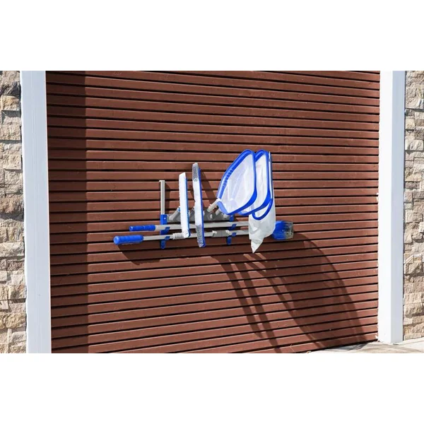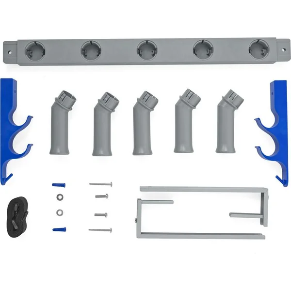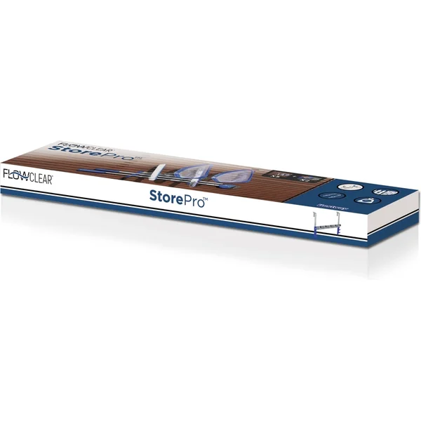 Avec le support Flowclear™ StorePro™, vous pouvez ranger tous les accessoires de piscine à un seul endroit pratique. Il offre de l’espace pour jusqu’à cinq différents accessoires pour épuisettes, brosses, râteaux et aspirateurs de piscine d’un diamètre de 3 cm. Tout ce dont vous avez besoin pour votre piscine est donc toujours à portée de main. De plus, le support sert d’espace de rangement pour deux barres et dispose également d’une sangle et de crochets pour d’autres accessoires. L’installation est très simple. Vous pouvez soit suspendre le StorePro™, soit le fixer à d’autres objets, comme un mur, à l’aide des vis fournies. Les crochets offrent 7,62 cm de liberté de réglage et donnent au StorePro™ une grande flexibilité et polyvalence d’utilisation. Fabriqué en acier durable et en plastique,