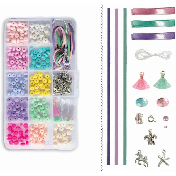 Dans cette jolie boîte, retrouve tout le nécessaire pour fabriquer de magnifiques bracelets multi rangs aux perles heishi ! Cette Bijoux box contient : 250 perles heishi chunky, 8 m de ruban et cordon en suedine, 3 charms, pompons, chaîne, perles, 6 fermoirs, 10 anneaux, 1 pince et 1 livret d’instructions.