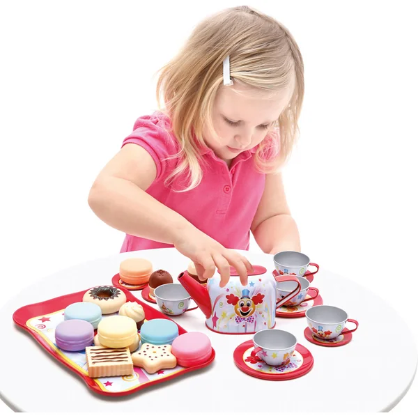 Service à thé décoré de jolis motifs de cirque et d’illustrations d’un clown amusant. Vos enfants vont adorer ce design spécial et passeront des heures à prendre le thé de l’après-midi avec cet ensemble de thé en métal pour poupées, comprenant un plateau de service et quelques friandises. Les enfants peuvent organiser une fête de thé de l’après-midi avec leurs amis et leur famille.