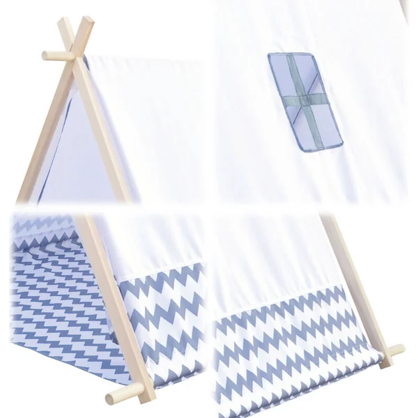 Tente de jeu pour enfants. Elle comprend une fenêtre aérée, une porte à rideau ouvert et un sol.