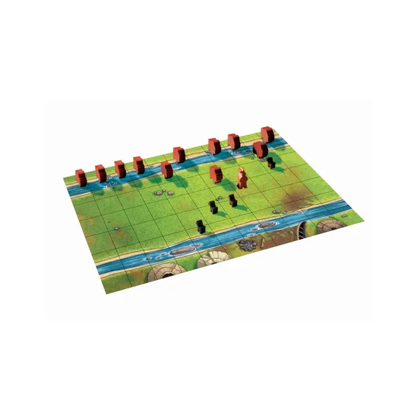 Règle du jeu : Place les 11 bisons d’un côté du jeu, en ligne droite derrière une des rivières et, juste devant l’autre rivière, place le chef indien avec ses chiens de part et d’autre. Les bisons avancent comme des pions aux échecs, les chiens comme des dames mais ne peuvent pas prendre de bison, et le chef indien comme un roi, il peut prendre les bisons.Les bisons commencent… A la fin de la manche, on intervertit les rôles. Le premier à remporter une manche des deux cotés gagne la partie.