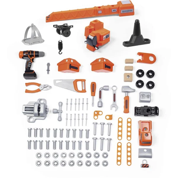 Établi Bricolo Builder Black & Decker. Il est composé de : Plusieurs bacs de rangement, 1 marteau, 1 scie, 1 clé plate, 1 tournevis, 18 écrous, , 20 vis, 6 clous, 1 set de planches de construction (x6), 1 perceuse mécanique, 1 règle mécanique, 1 fonction tape/tape clou. 2 véhicules à construire sont inclus dont une grue pouvant pivoter, descendre et monter des charges, ainsi qu’un camion modulable. Établi complet avec perceuse mécanique, scie électronique et 94 accessoires. Sers-toi de la grue pour construire 2 véhicules ! Avec effets sonores et zones de rangement.