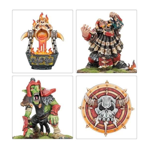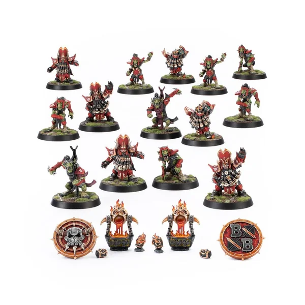 Ce kit plastique permet d’assembler les Zharr-Naggrund Ziggurats, une équipe de Nains du Chaos utilisable dans les matchs de Blood Bowl. L’équipe est composée de six Hobgoblin Linemen, de quatre Chaos Dwarf Blockers, de deux Hobgoblin Sneaky Stabbas et de deux Chaos Dwarf Flamesmiths. Vous trouverez deux options de têtes pour chaque corps, ainsi que d’autres options pour personnaliser votre équipe. De plus, vous trouverez deux pièces Blood Bowl double face, deux marqueurs de tour et de relance, quatre ballons et une planche de décalcos.