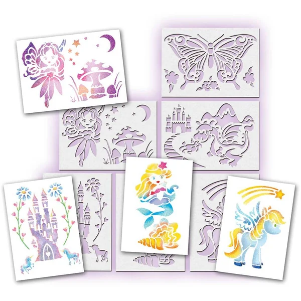 Découvre de nouveaux pochoirs féériques dans ce set pour créer des dessins girly de toutes les couleurs ! Une fée, une sirène, un dragon… Laisse libre-cours à ton imagination !