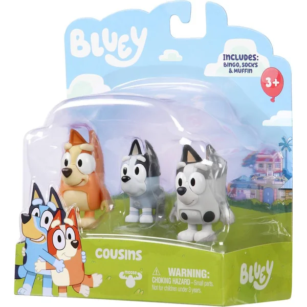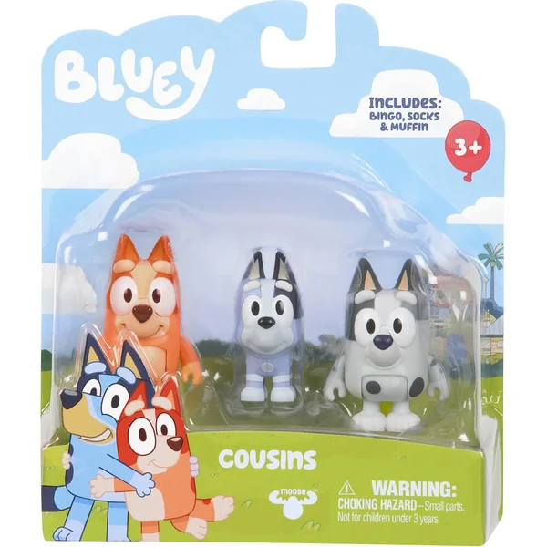 Le monde joyeux et imaginatif de Bluey et sa famille s’invite chez toi avec ces adorables figurines ! Ce coffret comprend la figurine de Bingo, la petite sœur de Bluey, et celles de Muffin et Socks, leurs cousines. Les figurines de Bingo et Muffin incluses dans ce coffret sont articulées au niveau du torse et des bras. Elles sont parfaites pour recréer certaines des meilleures scènes du dessin animé ! Contenu : 3 figurines.