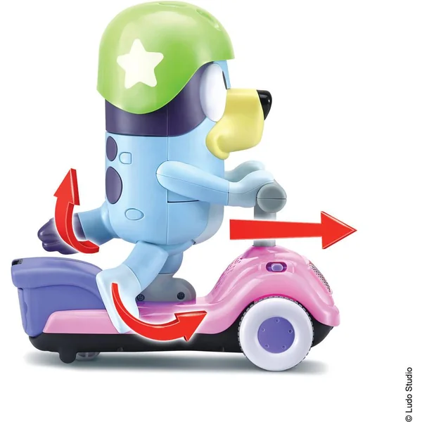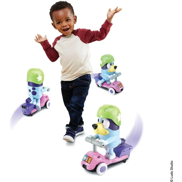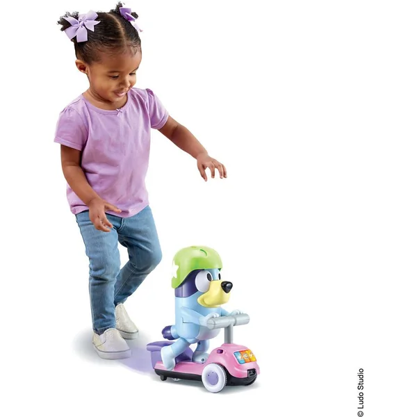 Bluey s’élance sur sa trottinette interactive ! 3 modes de jeu sont inclus pour suivre Bluey, imiter Bluey et la voir faire son show. En mode spectacle, Bluey fait son show sur des mélodies issues de la série. Les capteurs à l’avant et à l’arrière de la trottinette détectent les obstacles et permettent de les contourner. La queue et la jambe de Bluey bougent en rythme lorsqu’elle avance. En appuyant sur l’un des trois boutons lumineux situés à l’avant de la trottinette, l’enfant déclenche des phrases, des chansons, des sons et des mélodies. Avec la vraie voix de Bluey. Réglage du volume sonore et arrêt automatique. Pile de démonstration fournie