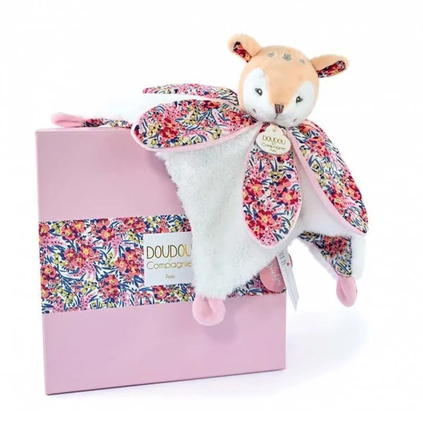 Le Doudou Faon BOH’AIME avec Pétales , une jolie frimousse, des matières douces combinées à de fraîches textures, une multitude de pétales, nouettes à manipuler et un imprimé exclusif crée par nos stylistes !