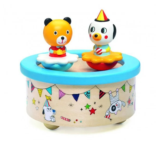 Découvrez la boite à musique Fantasy Melody de Djeco, une jolie boite à musique ronde en bois avec deux personnages rigolos pour éveiller ou endormir les bébés.