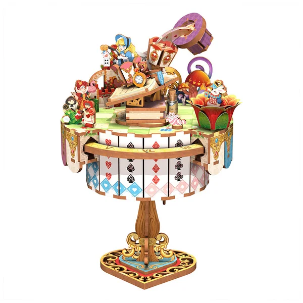 L’histoire de la visite d’Alice au salon de thé du Chapelier Fou, après être tombée accidentellement dans le mystérieux terrier du lapin, est représentée sur cette table à thé unique.