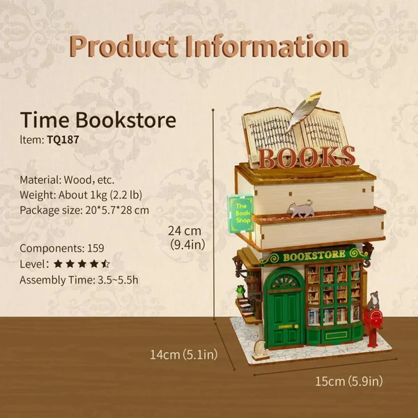 Cette librairie vintage, finement conçue, offre un lieu calme et confortable pour les lecteurs. Un chat repose sur la boîte aux lettres rouge devant la librairie, comme une invitation chaleureuse. Fait intéressant, une rangée de miniatures Book Nook orne la vitrine du magasin.
