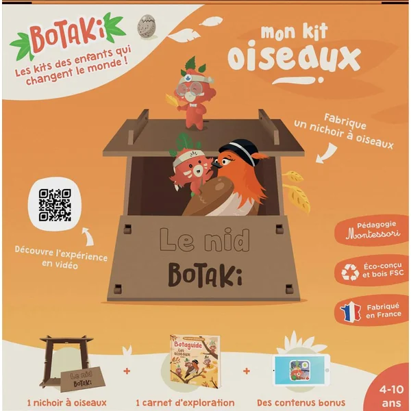 Botaki propose aux enfants de découvrir les oiseaux ! À travers un coffret contenant tout le nécessaire pour fabriquer un nichoir en bois, ils vont participer à protéger et observer les oiseaux qui les entourent. Le coffret contient : 1 carnet d’exploration de 30 pages dédié aux oiseaux, 1 nichoir en bois en kit et 1 accès à l’application ludo-éducative avec des jeux et des quiz pour tester ses connaissances. Fabriqué en France. Age conseillé : en autonomie à partir de 6 ans, accompagné à partir de 4 ans. Dimensions : du nichoir assemblé 21 x 17.5 x 12 cm, du coffret : 24 x 24 x 2.7 cm. En lien avec l’application « Village Botaki » : joue et teste tes connaissances, compatible tablettes et smartphones IOS et Androïd. 1 accès gratuit à l’application ‘Village Botaki’ inclus. Tablette et smartphone non fournis. Kit clé en main (montage sans clou, ni colle, ni vis). En bois certifié. Assemblé par des travailleurs en situation de handicap. Imprimé par un imprimeur labellisé. Eco-conçu, recyclé et recyclable.