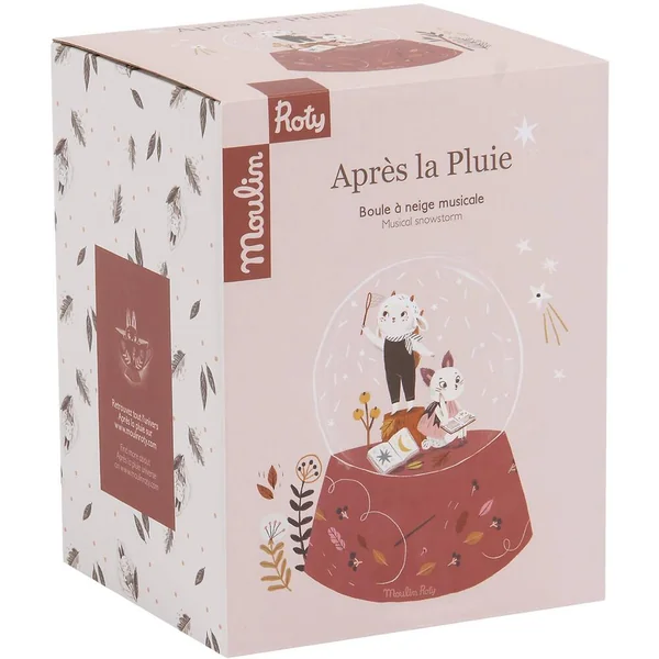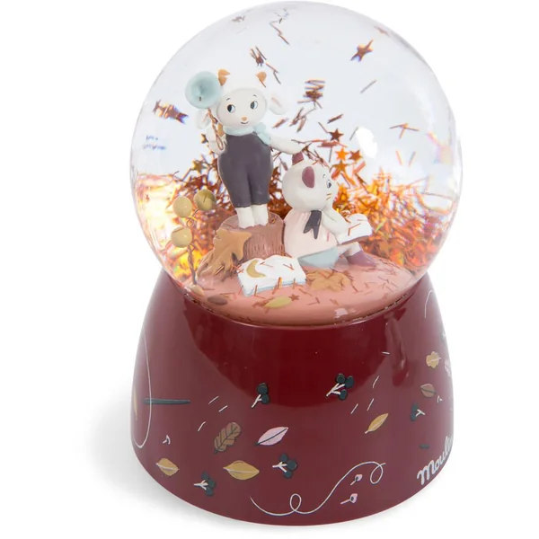 Boule à neige musicale avec Brume en pleine lecture, et Nuage debout pour attraper les paillettes brillantes ! En plus de décorer sa chambre, une jolie mélodie viendra bercer bébé au moment du coucher…