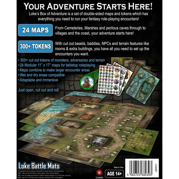 Elles peuvent s’assembler entre elles pour créer de plus grandes maps. La box contient aussi environ 300 éléments à découper : des monstres, et du décor, pour donner vie à vos parties. On y trouve aussi un code à taper sur internet pour obtenir les cartes en version digitale. Cette box est un élément indispensable pour tout maître de jeu. Conçue pour illustrer et aider à suivre les rencontres ainsi que pour stimuler un peu l’imagination, cet outil réduit énormément le temps de préparation des parties, et immerge le joueur dans son univers fantasy.