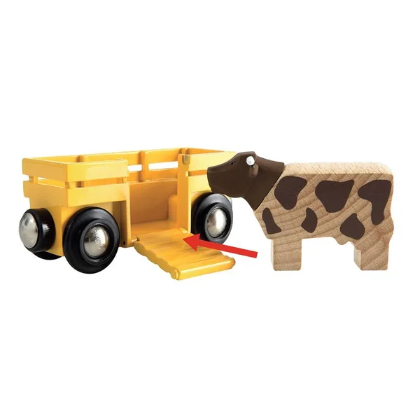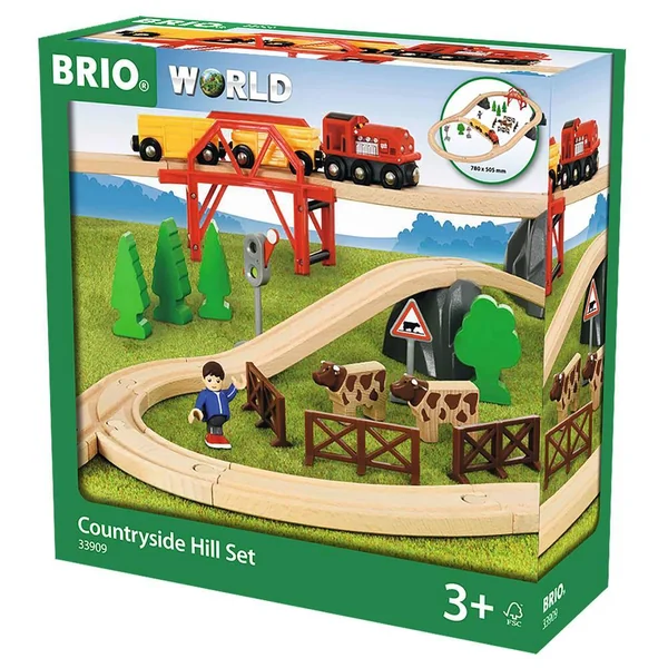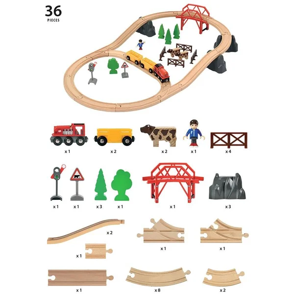 Inclus 1 locomotive, 2 wagons, 2 animaux, 1 personnage, 1 pont, des rails et des accessoires.