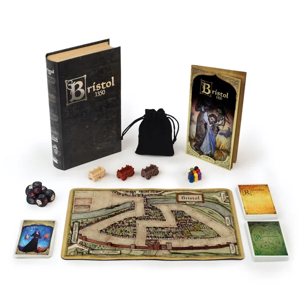 En apparence, Bristol 1350 est à la fois un jeu d’équipe coopératif, une stratégie de course et une déduction sociale. En réalité, il s’agit d’une course égoïste pour quitter la ville le plus rapidement possible sans attraper la peste, par tous les moyens !