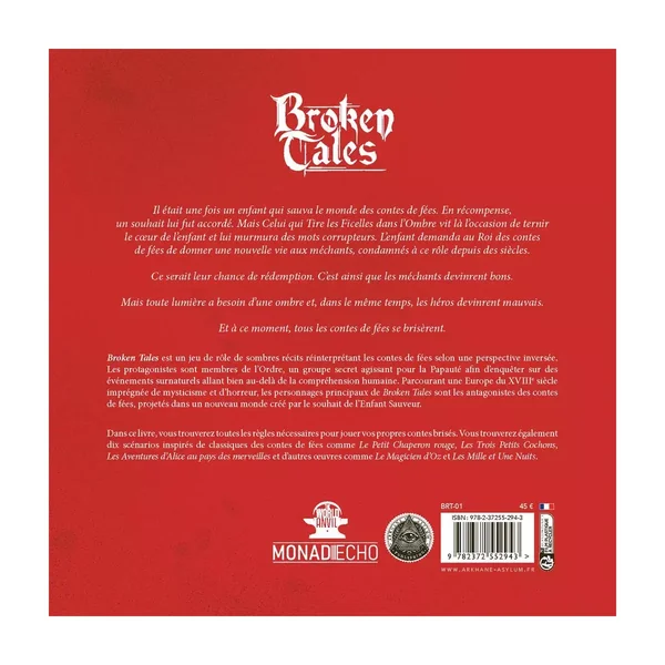Broken Tales est le livre de base du jeu de rôle Broken Tales, de 274 pages couverture cartonnée, édité par Arkhane Asylum utilisant le système Monad Echo.