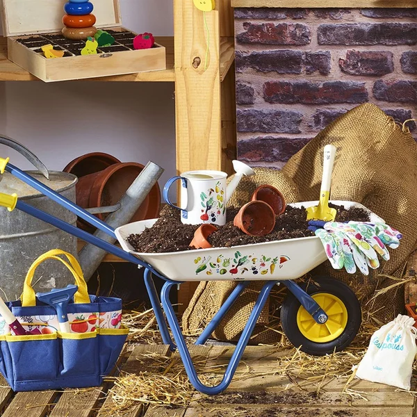 Cette brouette, spécialement conçue pour les jeunes jardiniers, est parfaite pour transporter des trésors du jardin, des jouets, et surtout aider maman et papa à jardiner.