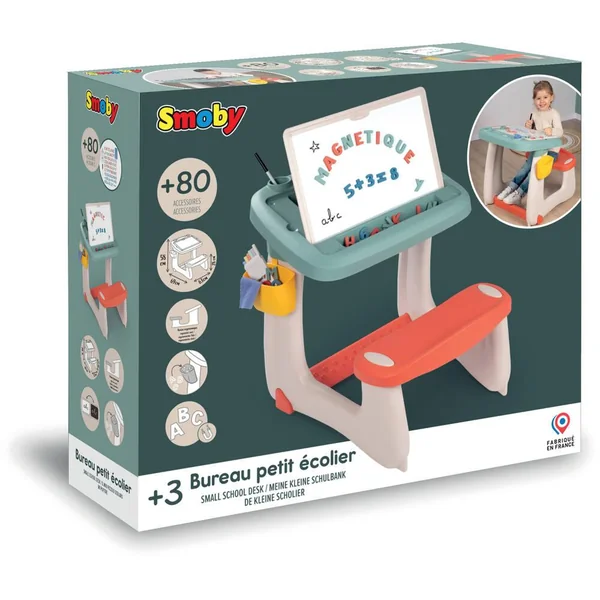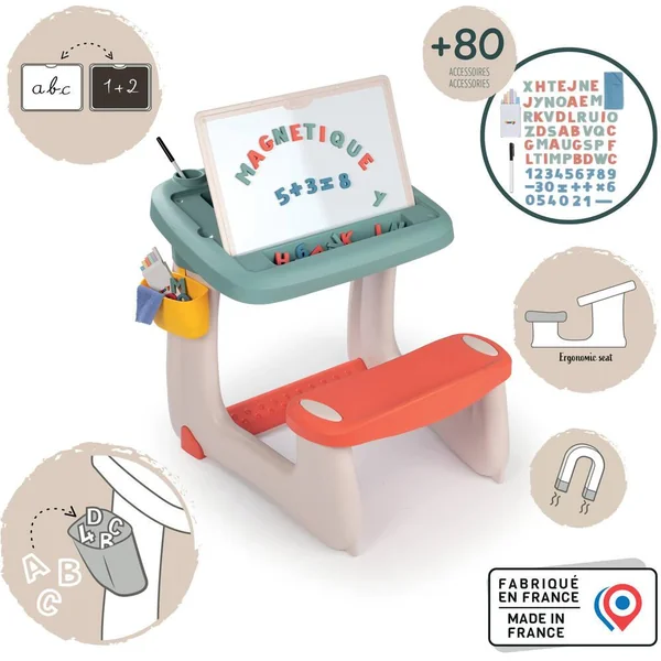 Bureau ergonomique Petit Ecolier. Caractéristiques : – Ardoise double face amovible : un côté noir pour les craies, et une face magnétique blanche pour écrire au feutre effacable – Grand bac de rangement sous l’ardoise – Qualité Smoby : robuste et stable. Pieds en plastique soufflé pour une meilleure stabilité – Ergonomique pour les enfants, avec notamment une traverse pour les pieds – Accessoires : 72 lettres et chiffres magnétiques, poubelle/bac à lettres, 1 feutre effacable, 6 craies et 1 chiffonnette –
