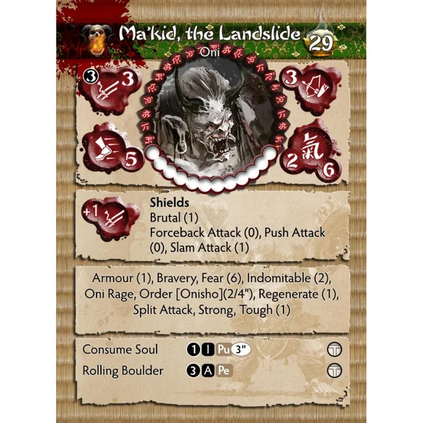 Ma’Kid atteint presque toujours sa cible, modifiant le champ de bataille pour y parvenir. Il peut repousser de nombreux modèles hors de son chemin, les plaquant même à terre dans le processus. Ma’Kid manie deux immenses gongs de temple comme boucliers, lui offrant une protection sans précédent pour un Oni. En combinant Parade et Robustesse, Ma’Kid peut encaisser des coups extrêmement puissants.