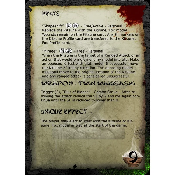Kitsune a quitté les rangs de son peuple en s’alliant à la cause du Temple. Sa mobilité sur le champ de bataille améliore grandement la capacité du Temple pour atteindre ses objectifs.