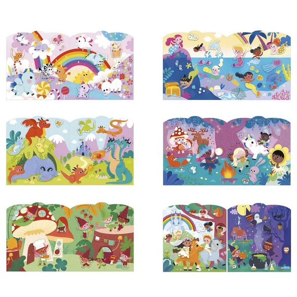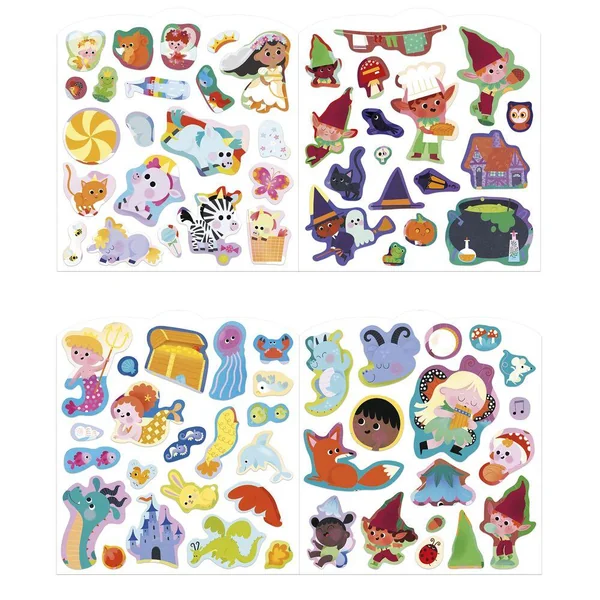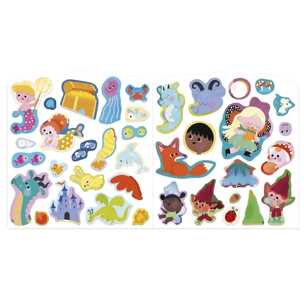 Un monde fantastique ! Ce cahier silhoueté se compose de 12 pages de décors illustrés sur la thématique des pays magiques : licornes, princesses, … à compléter à l’aide des 8 pages d’autocollants soit 70 au total. Les emplacements des autocollants sont en couleur descendue pour aider l’enfant à les identifier. Chaque autocollant à une forme simple pour faliciter la préhension, sans débord. Ils se collent et se décollents facilement et sont présentés en planches agrafées dans le cahier. Cette activité permet de développer sa patience et sa motricité fine.