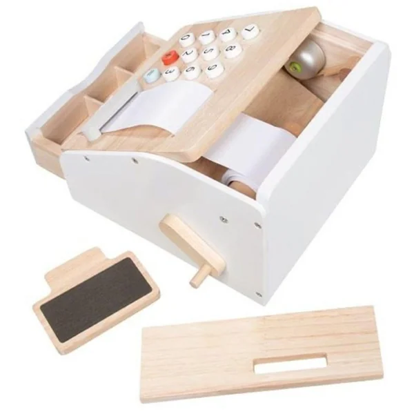 Cette élégante caisse enregistreuse s’ouvre en émettant un petit effet sonore. Elle offre également de nombreuses fonctions de jeu. L’affichage peut être écrit à la craie.