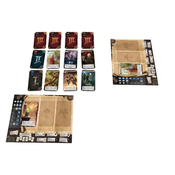Les 3 actes du jeu sont symbolisés par 3 cartes spécifiques définissant vos compétences de départ et vos objectifs personnels : Origine, Motivation et Destin. Vos cartes Origine et Motivation indiquent vos bonus, votre carte Destin vos objectifs cachés de scoring.