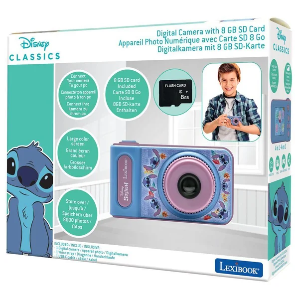 Magnifique Caméra pour enfants Stitch avec jeux et musiqueÉcran TN de 2 poucesPeut jouer à des jeux et à de la musique !Rechargeable avec le câble USB-C (batterie 400mAh) Dimensions du produit : 8.2×4.9×4.3 cm