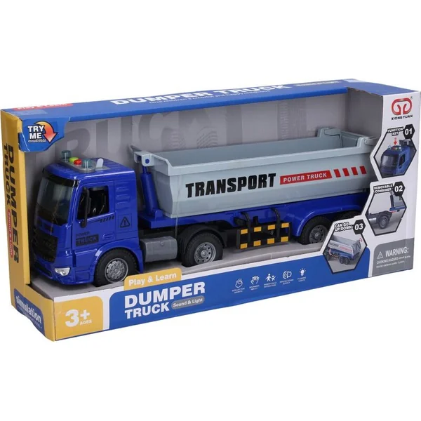 - Émet des effets lumineux et sonores. Activation par des boutons sur le toit. Bouton 1 – son du moteur, son de basculement. Bouton 2 – son de marche arrière, son de klaxon. Pile 3xAG13 incluse (1,5V). Portes ouvrantes, benne basculante, sur volant d’inertie. La remorque peut être détachée.