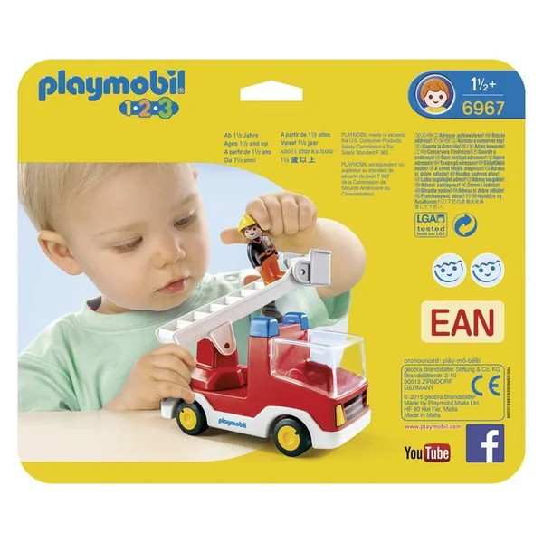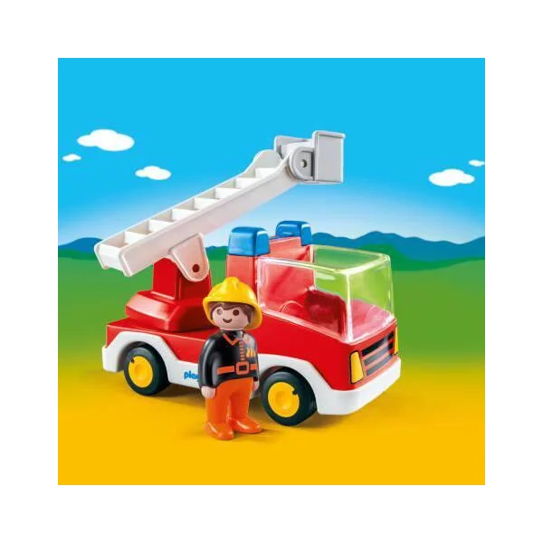 Le pompier s’installe à bord de son camion. Il fait pivoter l’échelle pour sauver les personnes en danger. Le camion comprend une place et un crochet d’attelage. L’échelle pivote à 360° et la nacelle est mobile. Le personnage tient sur l’échelle. La nacelle comprend une place. La boîte contient 1 personnage et 1 camion de pompier. L’échelle pivote et possède différents niveaux d’élévation. Le camion possède une attache à l’arrière.