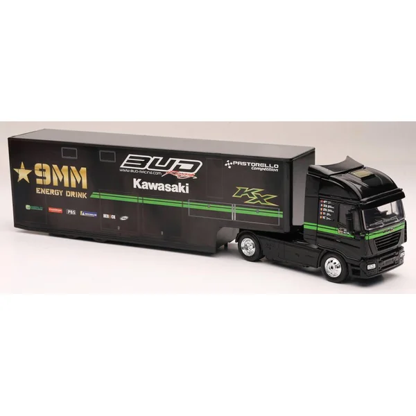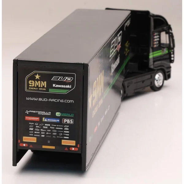 Réplique officielle en Die-Cast du camion Iveco du Team 9 MM/Bud Racing. Portes de la cabine et du container fonctionnelles.