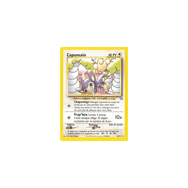 Découvrez Capumain (ng026), une carte Pokémon de l’extension Neo Genesis, provenant du bloc Wizards. Idéale pour compléter votre collection, cette carte Peu Commune plaira autant aux collectionneurs qu’aux joueurs.