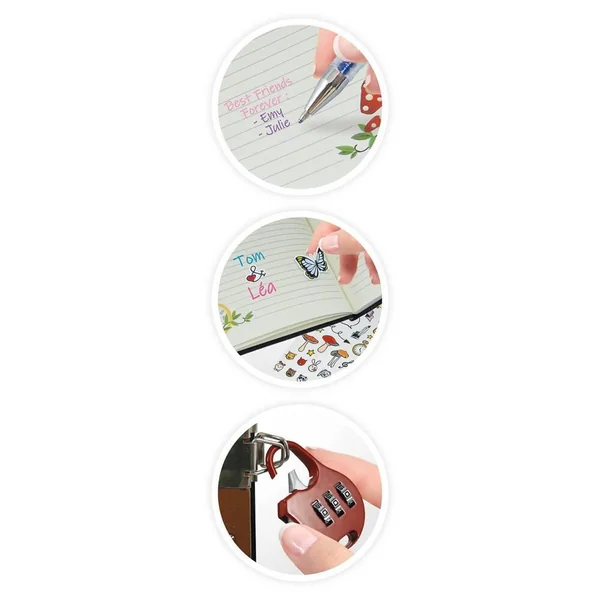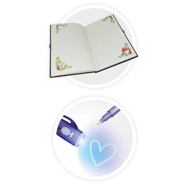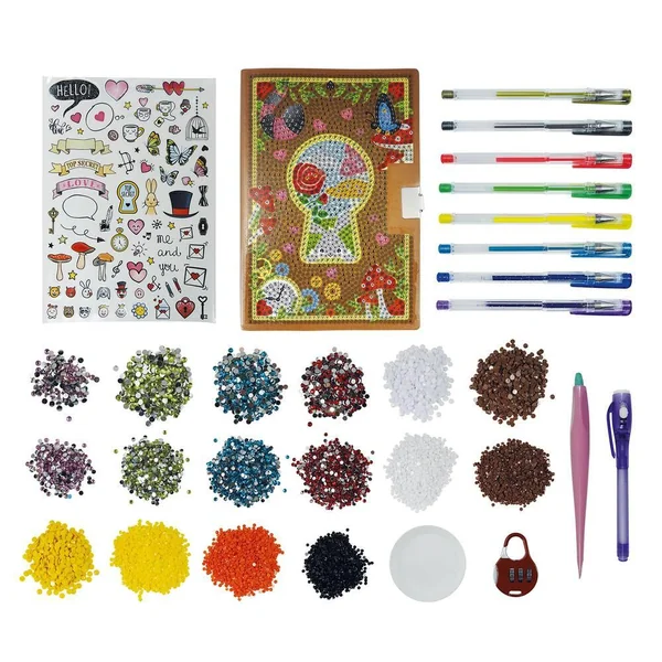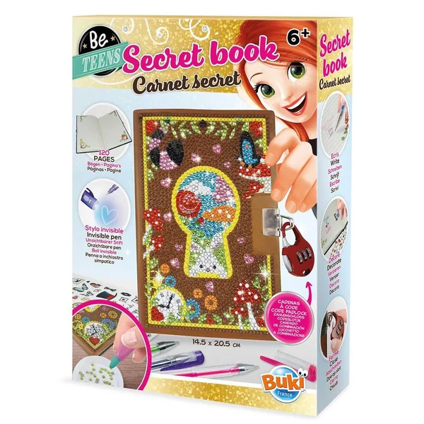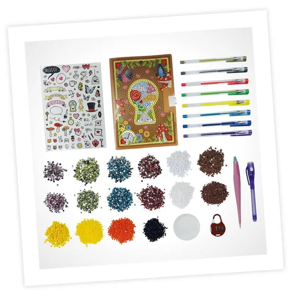 Colle les strass sur les numéros, lettres ou symboles correspondants pour créer une couverture de carnet secret unique ! Un cadenas à code est fixé sur le carnet pour que personne ne puisse l’ouvrir Carnet de 120 pages décorées – format A5 1 stylo UV pour écrire des messages secrets et les révéler grâce à la lampe UV intégrée Inclus: 8 stylos gel avec effets néon, paillettes et métallique 1 feuille A5 de stickers.