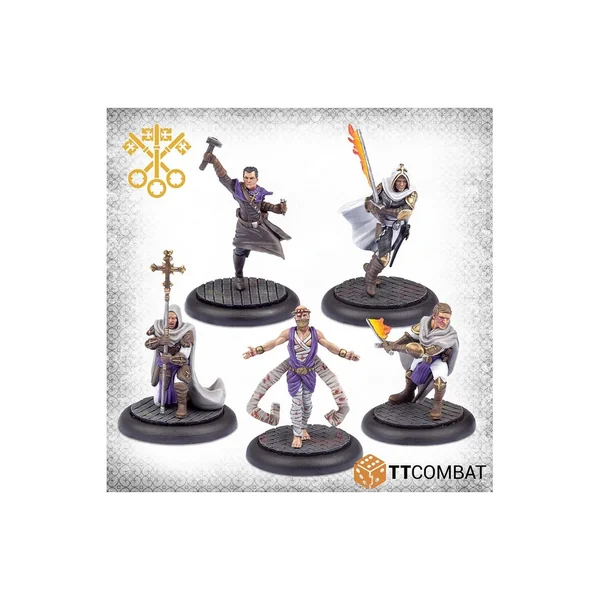 En tant que joueur du Vatican, vous pourriez avoir besoin de capacités offensives mortelles. Dans cette boîte, vous trouverez pas moins de quatre héros et un homme de main, chacun apportant une puissance significative à votre gang ! Des Prélats de l’Epée Flamboyante à l’impitoyable Crucifère, ces guerriers ont beaucoup de punch.