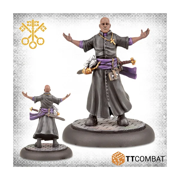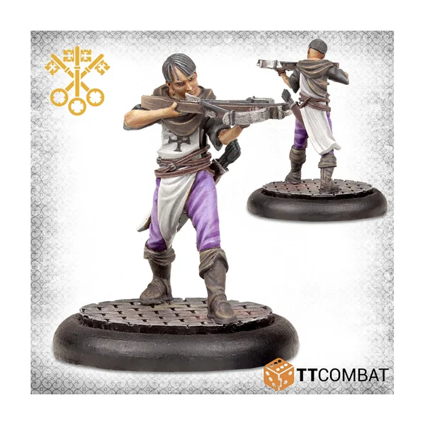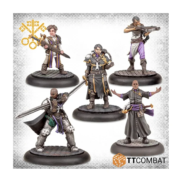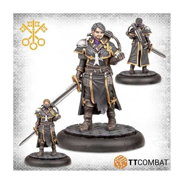 Cette boîte apporte des renforts sacrés à votre gang du Vatican. Le Templier est un héros polyvalent qui peut aussi bien infliger des dégâts à distance qu’au corps à corps. Il est accompagné d’une Vénérable de la Dévotion, une guerrière fidèle qui peut abattre les plus grands ennemis avec sa grande épée Zweihander. L’aumônier apporte la prière dans les rues vénitiennes. Ce personnage permet à tout soldat ami de voir le chemin à suivre grâce à sa communion psychique. Ces chevaliers templiers sont soutenus par leur fidèle écuyer maltais et leur page de reliquaire, qui aideront leurs maîtres de toutes les manières possibles au cours de la bataille.