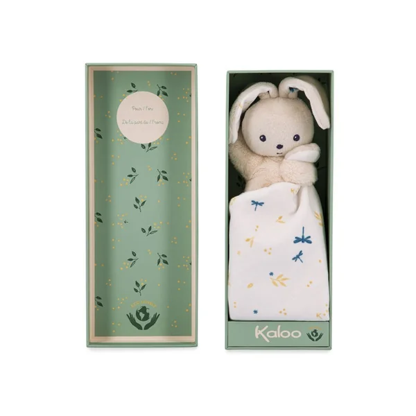 Ce lapin enveloppé dans un carré de douceur sera le meilleur compagnon de bébé. Fait de matières et rembourrage recyclés à partir de bouteilles en plastique, ce doudou est 100% écoresponsable. Avec son petit corps moelleux en micro-velours, le lapin est facile à agripper et tenir par le corps ou les longues oreilles. Le doudou carré entre ses mains est habillé de petites libellules qui virevoltent entre les brindilles dorées. Cet imprimé délicat et poétique se retrouve dans les oreilles du lapin et réhausse le tout. Présenté dans un bel écrin, ce dernier peut être réutilisé comme étui de rangement. C’est le doudou parfait pour offrir un cadeau 100% « éco-lovely ».