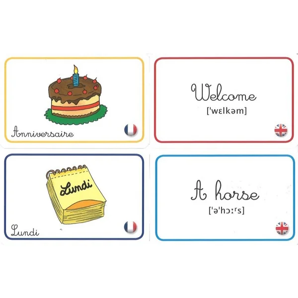 On retrouve d’un côté un dessin et sa signification en français, et au dos la traduction anglaise correspondante, ainsi que la phonétique pour une meilleure prononciation.