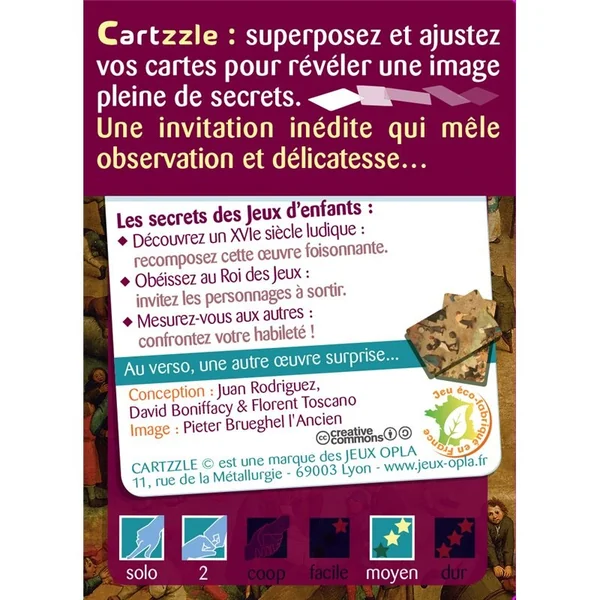 Superposez et disposez vos cartes dans tous les sens pour composer, avec délicatesse, l’image originelle. Puis, refaites-la en relevant les défis afin de résoudre les mystères de l’œuvre.