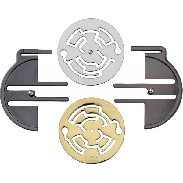 Ce médaillon est un casse-tête complexe de type labyrinthe, qui consiste en deux disques de couleur or et argent inextricablement reliés par deux pièces noires centrales. Pour les libérer, faites tourner les disques et écartez les pièces. Si vous essayez de prendre un raccourci, vous tombez dans une impasse. Pour résoudre le problème, deux possibilités : l’intuition ou l’analyse. C’est vous qui voyez.