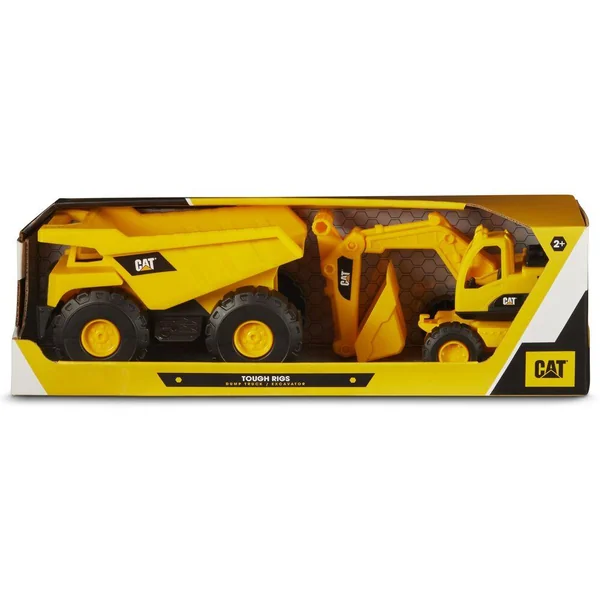 Comprend deux véhicules de 38 cm à roues libres. Un camion à benne basculante et une excavatrice.