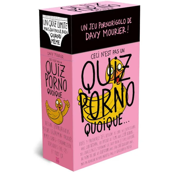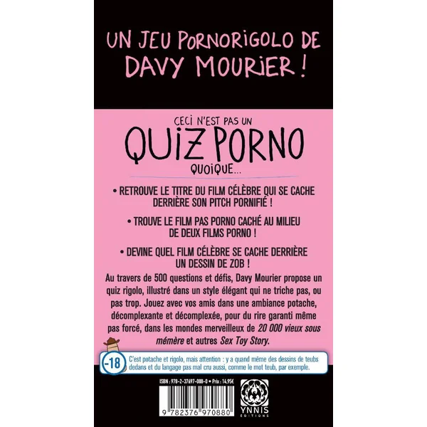 Au travers de 500 questions et défis, Davy Mourier propose un quiz rigolo, illustré, dans un style élégant qui ne triche pas, ou pas trop. Jouez avec vos amis dans une ambiance potache, décomplexante et décomplexée, pour du rire garanti même pas forcé, dans les mondes merveilleux de 20 000 vieux sous mémère et autres Sex Toy Story. Un quiz limite mais qui passe bien quand même.