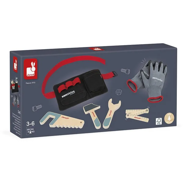 Voici tout ce qu’il faut pour bien bricoler : une ceinture en tissu pouvant accueillir les 4 outils en bois fournis (scie, marteau, clé, règle pliable) et une paire de gant de bricolage (taille XS – 4). La ceinture, réglable, s’ajuste autour de la taille de l’enfant. Votre bricoleur est paré pour tous les travaux de bricolage partout dans la maison ! Jouet en bois et en tissus. Pour enfants de 3 à 6 ans.