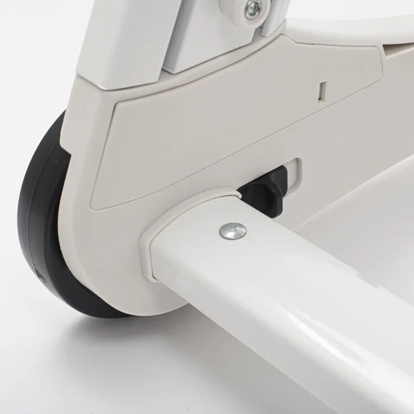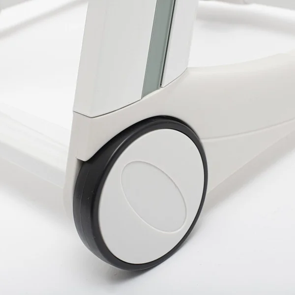 - La chaise est équipée de deux roues freinées et de deux pieds en caoutchouc