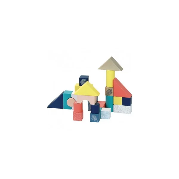 Un joli chariot de marche avec 24 cubes en bois aux couleurs naturelles et acidulées.