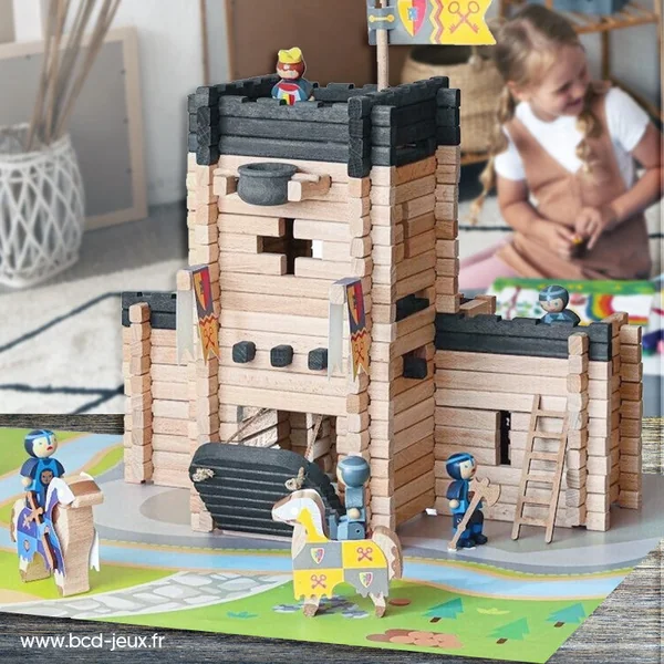 Pour vivre de grandes aventures de chevaliers ! L’enfant prendra plaisir à construire son Château Fort, il installera le pont levis, la prison, le chemin de guet, les drapeaux, équipera les chevaux et assemblera la catapulte. Il pourra ensuite se raconter plein d’histoires en jouant avec les nombreux accessoires. Pour protéger le roi, les chevaliers feront fuir les assaillants en utilisant le chaudron ou s’exerceront dans l’art du lancer de boulet au moyen de la catapulte … Ils pourront enfermer les attaquants dans la prison qu’ils protégeront avec la hache, l’épée…