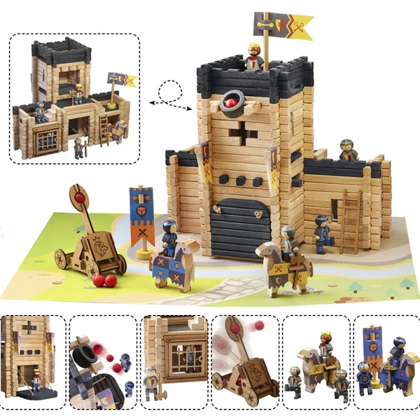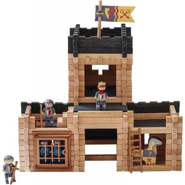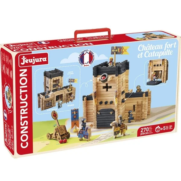 Château Fort et Catapulte – 270 pièces : jeu de construction en bois brut et teinté.