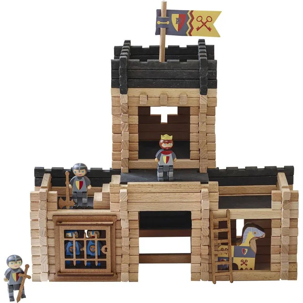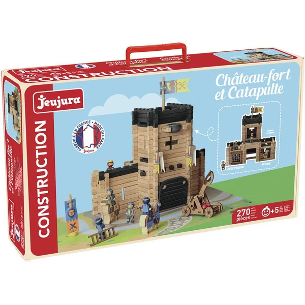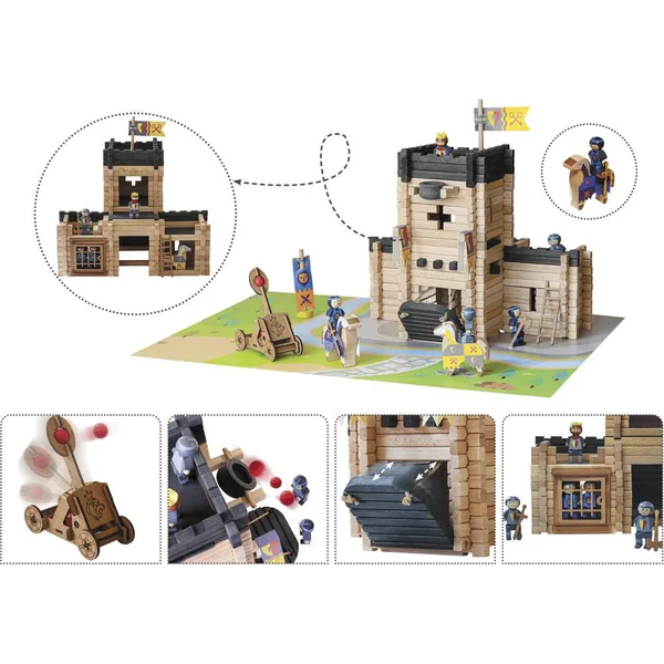 Château Fort et Catapulte – 270 pièces : jeu de construction en bois naturel et teinté avec une notice de montage, un tapis de jeu et de nombreux accessoires pour vivre de grandes aventures de chevaliers.